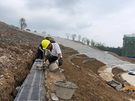 花谷擋墻由一塊一塊的扁平景觀石砌筑而成,平臺(tái)最窄處僅3米多寬,且每級(jí)臺(tái)階之間垂直落差有1.5米,在陡峭狹長(zhǎng)的空間上,工人在石料和種植土運(yùn)輸時(shí)首先將基礎(chǔ)土方開挖至臺(tái)階狀,再進(jìn)行墻體基礎(chǔ)及砌筑施工。因施工材料無法直接到達(dá)現(xiàn)場(chǎng),施工隊(duì)用了10-12臺(tái)鏟車將碎石、混凝土、景觀片石二次轉(zhuǎn)運(yùn)至施工位置;種植土回填則是以大挖機(jī)配合小挖機(jī),從上下兩個(gè)方向向中間轉(zhuǎn)運(yùn)。