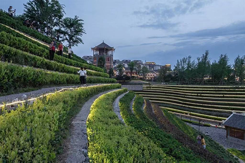 荊門園博園位于漳河新區(qū),總占地2030畝,以雙喜大道為界分為北區(qū)、南區(qū)兩大區(qū)域。整個(gè)園區(qū)共有三個(gè)主入口,一個(gè)是位于蒙泉路與天山路交會(huì)處的東入口,入口兩側(cè)分別為園藝中心及其配套服務(wù)區(qū),飛檐翹角的建筑樣式營(yíng)造出濃濃的楚韻古風(fēng)味;南入口位于花博園南區(qū)東側(cè),極具造型感的園博花街和大門是此處景觀亮點(diǎn);西入口從荊山大道進(jìn)入,入眼兩側(cè)為流線型的梯田花谷,一直延伸入園博園內(nèi)部,在加上虹橋、親水臺(tái)階等建筑,打造出“高山花谷”的景觀效果。