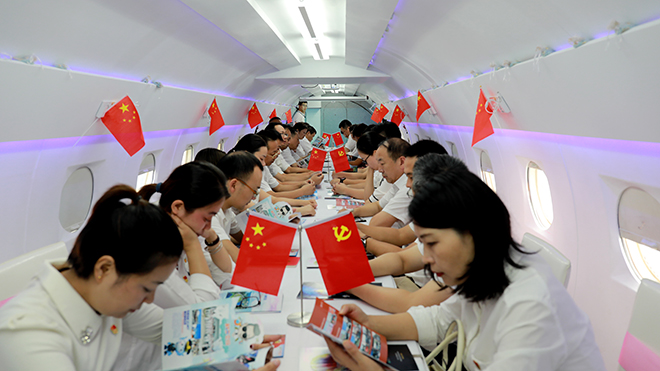 在新舟60飛機(jī)改造成的“極客之舟”上,全體黨員首先集體誦讀了《黨章》。隨后,集團(tuán)黨委副書記張本華同志根據(jù)本周市“不忘初心、牢記使命”主題教育領(lǐng)導(dǎo)小組辦公室學(xué)習(xí)提醒的有關(guān)要求,領(lǐng)學(xué)了《習(xí)近平關(guān)于“不忘初心、牢記使命”重要論述選編》和《習(xí)近平新時代中國特色社會主義思想學(xué)習(xí)綱要》的部分學(xué)習(xí)內(nèi)容。最后,全體黨員又集中觀看了《水轟5日志》、《永遠(yuǎn)的懷念》兩部紅色題材情景劇視頻;并在軍事體驗基地模擬紅藍(lán)軍對抗演練,充分接受愛國主義教育。