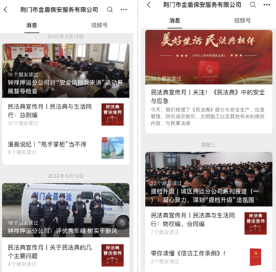 今年5月是《中華人民共和國民法典》實施以來的第二個宣傳月。根據(jù)市普法辦《關(guān)于開展“美好生活?民法典相伴”民法典宣傳月活動的通知》文件精神,近期,市城控集團(tuán)所屬子公司市金盾保安公司結(jié)合自身實際,通過線上、線下多種渠道開展了形式多樣、內(nèi)容豐富的民法典學(xué)習(xí)宣傳活動,積極營造濃厚的民法典學(xué)習(xí)宣傳氛圍。