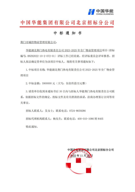 11月28日,荊門城控物業(yè)憑借專業(yè)的管理團(tuán)隊(duì)和良好的企業(yè)信譽(yù),成功中標(biāo)華能湖北荊門熱電有限責(zé)任公司2023-2025年全廠物業(yè)管理項(xiàng)目,中標(biāo)金額590萬(wàn)元。