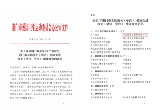 近日,荊門市愛衛(wèi)辦授予天城地下管廊有限公司“2022年無(wú)煙單位”榮譽(yù)稱號(hào)。