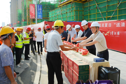慰問組先后來到城控?秀江南、市老干部活動中心、市傳染病醫(yī)院等項目現(xiàn)場,為一線工作人員送上西瓜、藿香正氣水、礦泉水等物資,并叮囑大家要注意勞逸結(jié)合,做好防暑降溫措施。