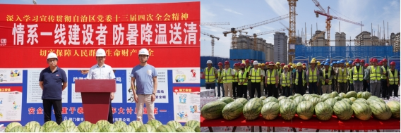 近日,荊門城控集團黨委委員、紀委書記、監(jiān)察專員鐘立峰帶隊深入銀川江山閱項目施工現場,開展黨員干部下基層察民情解民憂暖民心實踐活動暨“情系一線建設者,防暑降溫送清涼”慰問,為奮戰(zhàn)在江山閱項目上的一線員工發(fā)放礦泉水、西瓜等防暑降溫物資??∝S綠建集團、銀川分公司負責人等參加。