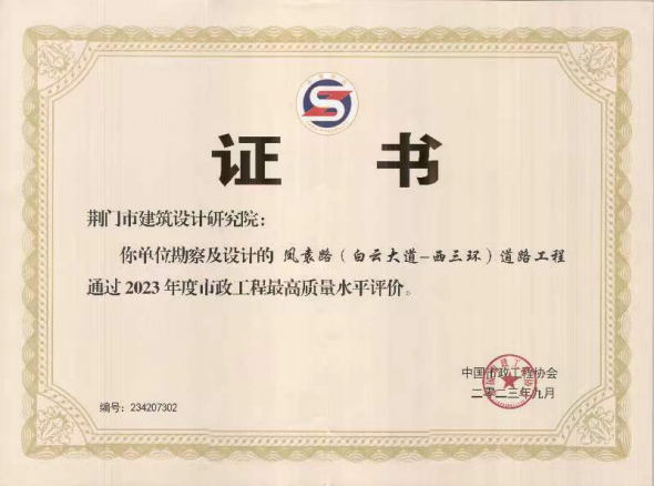 近日,市建筑設(shè)計(jì)研究院有限公司完成的鳳袁路(白云大道-西三環(huán))道路勘察項(xiàng)目榮獲2023年度市政工程最高質(zhì)量水平評(píng)價(jià)。