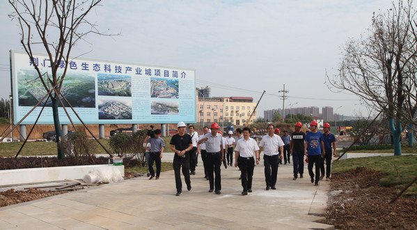 圖為市長張依濤(前排右二)調(diào)研荊門綠色生態(tài)科技產(chǎn)業(yè)城國際會展中心建設(shè)項目現(xiàn)場