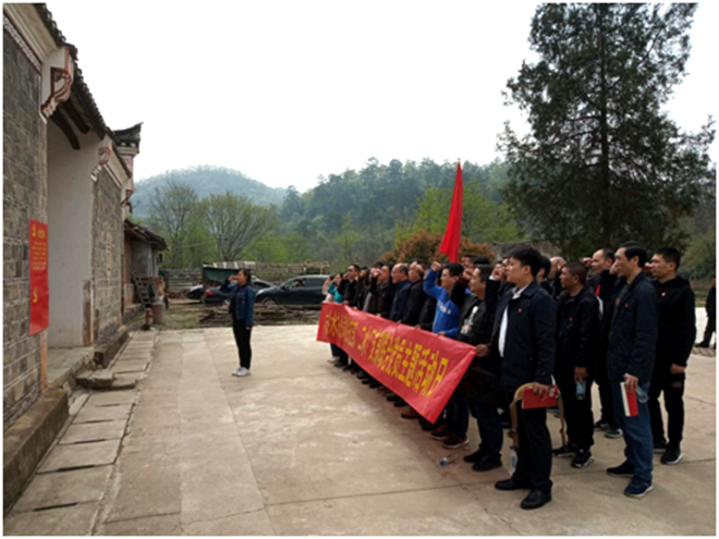 活動當天,全體黨員和入黨積極分子站在天星寨革命烈士紀念牌前,在主持人的帶領下,向革命先烈默哀,高唱國歌,面對鮮紅的黨旗重溫入黨誓詞,向革命烈士紀念牌敬獻花籃。隨后,在紅九師政治部舊址,黨總支書記李維波同志為全體黨員干部上了一堂生動的愛國主義黨課。