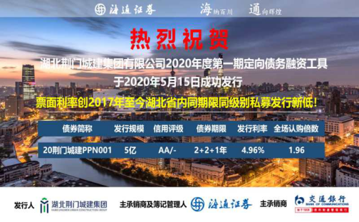 5月15日,市城控集團(tuán)所屬荊門城建集團(tuán)成功發(fā)行“20荊門城建PPN001”定向債務(wù)融資工具,融資規(guī)模5億元,期限5年,利率4.96%,該利率創(chuàng)2017年至今湖北省內(nèi)同期限同級(jí)別私募發(fā)行新低,同時(shí)也是截止目前唯一破“5”債券。