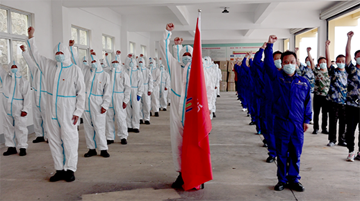 最后,張先勝為志愿者突擊隊授隊旗。志愿者代表接過隊旗后,現(xiàn)場全體人員振臂高呼:科學處置、同舟共濟、團結(jié)一心、戰(zhàn)勝疫情??谔柭晹S地有聲、鼓舞人心。