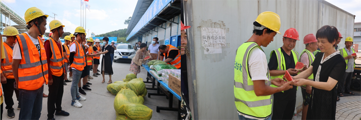 魯愛群一行深入各項(xiàng)目建設(shè)現(xiàn)場,了解項(xiàng)目建設(shè)狀況,并為項(xiàng)目人員送去了西瓜、金銀花露等防暑物品,每到一處,魯愛群都與一線施工人員親切交談,向他們表示誠摯慰問,叮囑他們把防暑降溫放在心上,將安全規(guī)范落實(shí)到實(shí)際行動(dòng)中,并要求各項(xiàng)目負(fù)責(zé)人合理安排作息時(shí)間,建立錯(cuò)時(shí)工作制,盡可能避開高溫時(shí)段,防止高溫中暑。