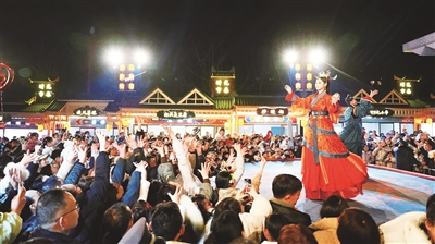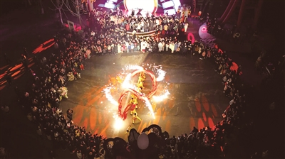 從園區(qū)門口的《迎賓出行圖》到入口廣場的虎座鳳鳥鼓架,從非遺打鐵花到舞龍舞獅,園博園內(nèi),燈火通明,人頭攢動。漫步其中,一步一景,一步一娛,整個園區(qū)雍容華貴、高雅大氣。