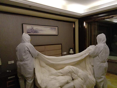 城控凱瑞國際酒店工作人員身著防護(hù)服,清掃留觀人員房間